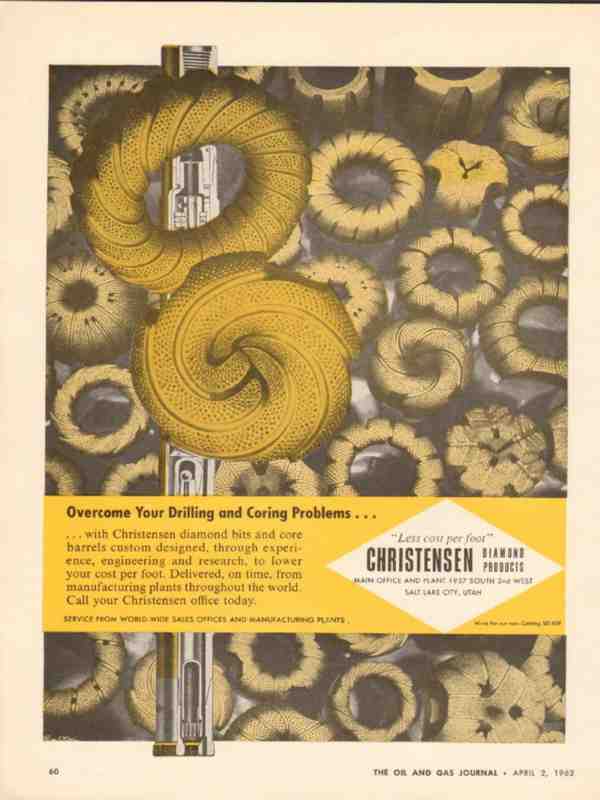 Original oil and gas trade vintage ad for CHRISTENSEN DIAMOND PRODUCTS COMPANY. Main office and factory was located at 1937 South Second West, Salt Lake City, UT. Overcome Your Drilling and Coring Problems with Christensen Diamond Bits and Core Barrels Custom Designed. This unique 1962 old oilfield petroleum drilling equipment magazine advertisement would display beautifully matted and framed.