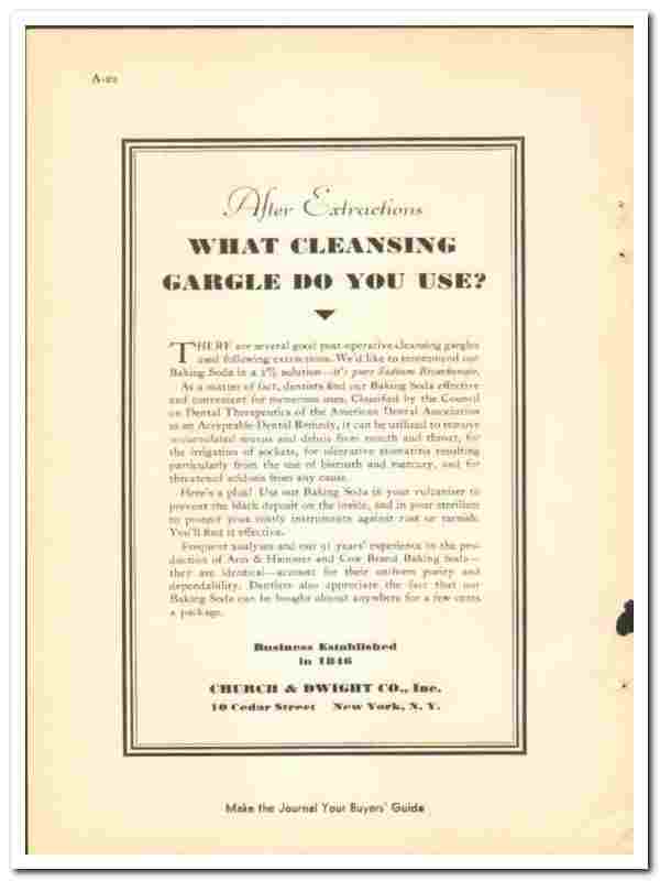 There are several good post operative cleansing gargles used following extractions. We'd like to recommend our Baking Soda in a 2% solution, it's pure Sodium Bicarbonate. As a matter of fact, dentists find our Baking Soda effective and convenient for numerous uses. Classified by the Council on Dental Therapeutics of the American Dental Association, as an Acceptable Dental Remedy, it can be utilized to remove accumulated mucus and debris from mouth and throat, for the irrigation of sockets, for ulcerative stomatitis resulting particularly from the use of bismuth and mercury, and fou threatened acidosis from any cause. Here's a plus! Use our Baking Soda in your Vulcanizer to prevent the black deposit on the inside, and in your sterilizer to protect your costly instruments against rust or tarnish. You'll find it effective. Frequent analysis and our 91 years experience in the production of Arm & Hammer and Cow Brand Baking Soda, they are identical, account for their uniform purity and dependability. Dentists also appreciate the fact that our Baking Soda can be bought almost anywhere for a few cents a package.