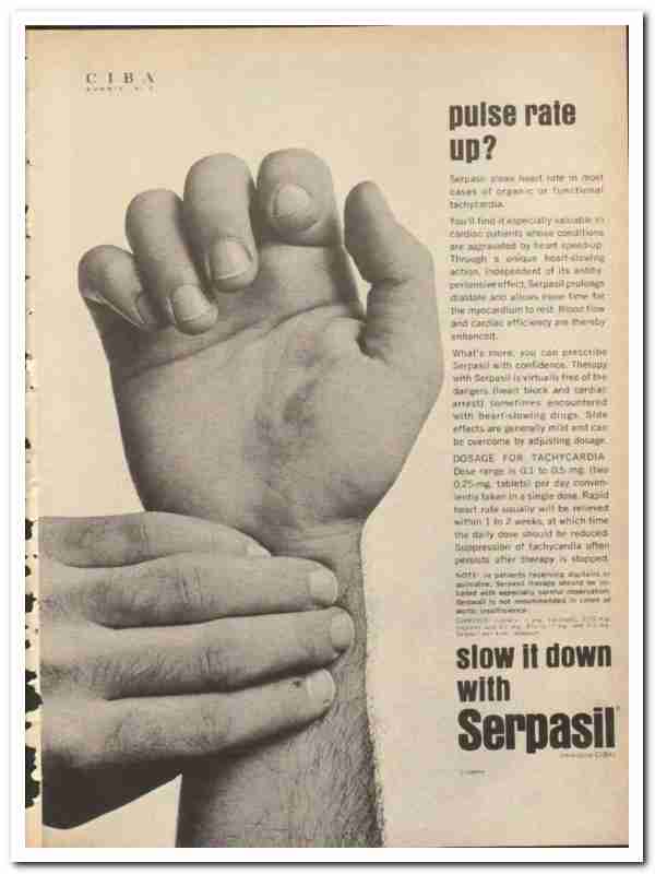 Ciba 1959 vintage medical ad Serpasil pulse rate down