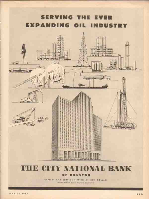 Original old petroleum banking industry trade magazine vintage ad for THE CITY NATIONAL BANK of Houston, TX. Serving the Ever Expending Oil Industry. This 1953 oil and gas financial magazine advertisement would display beautifully matted and framed.