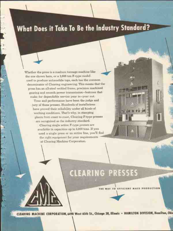 Original vintage industrial trade ad for CLEARING MACHINE CORPORATION. Main office and factory was located in Chicago, IL. What Does It Take To Be The Industry Standard? F-Type Presses for Stamping. Old 1953 industry magazine advertisement.