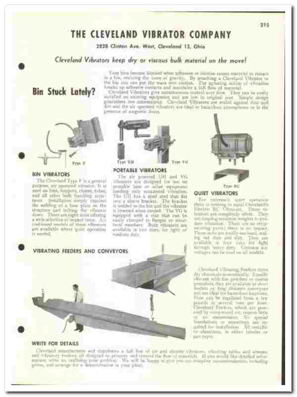 Original 1960 industrial trade vintage catalog for the CLEVELAND VIBRATOR COMPANY. Main office and plant were located at 2828 Clinton Avenue West, Cleveland, OH.
