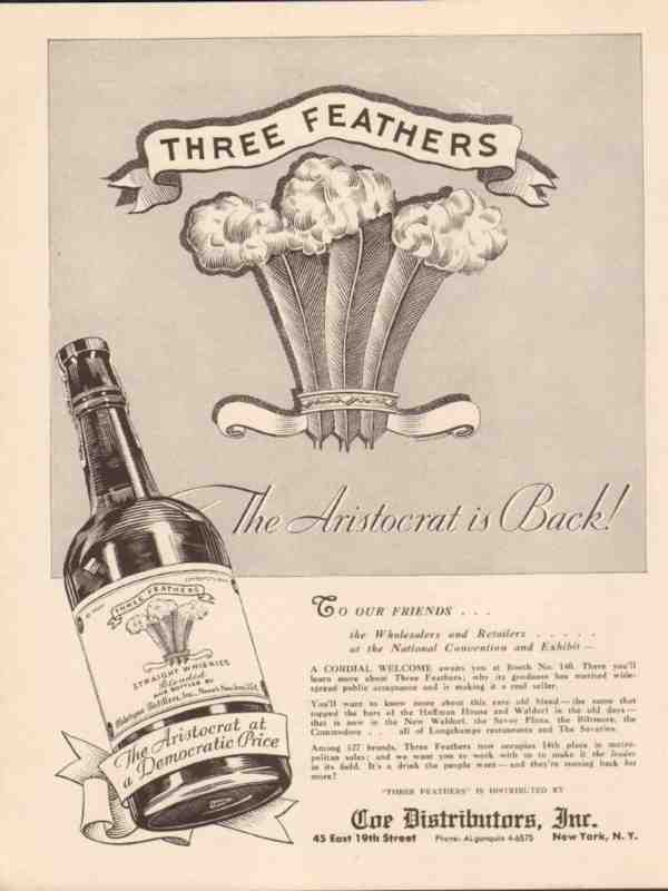 Original vintage whiskey, wine and spirits trade magazine ad for COE DISTRIBUTORS, INC. of New York City, NY. The Aristocrat is Back! Three Feathers Straight Whiskies. Served at the bars in the New Waldorf, the Savoy Plaza, the Biltmore, the Commodore, all of Longchamps restaurants and The Savarins. Old 1934 rare Post Prohibition era whiskey advertisement, would display beautifully matted and framed.