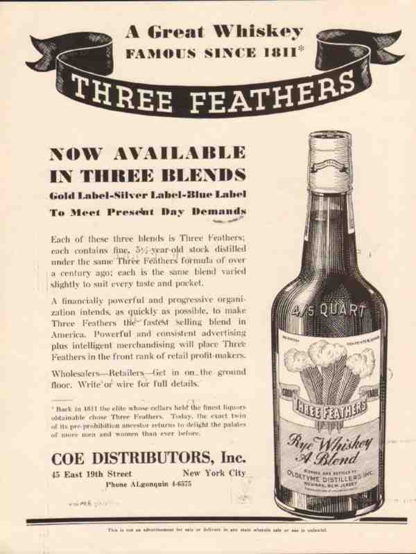Original vintage whiskey, wine and spirits trade magazine ad for COE DISTRIBUTORS, INC. of New York City, NY. A Great Whiskey Three Feathers Now Available in Three Blends, Gold Label, Silver Label, Blue Label to Meet Present Day Demands. Blended and bottled by Oldetyme Distillers, Inc. of Newark, NJ. Old 1934 rare Post Prohibition era whiskey advertisement, would display nicely matted and framed.