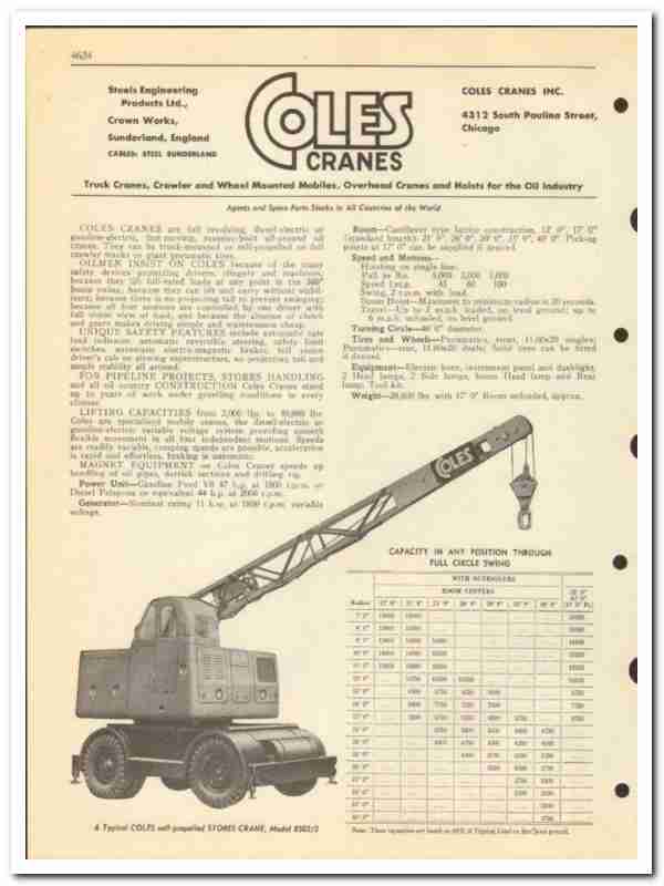 Products include Truck Cranes, Crawler and Wheel Mounted Mobiles, Overhead Cranes and Hoists for the Oil Industry. Coles Cranes are full revolving, diesel-electric or gasoline-electric, fat-moving, massive-built all-around oil cranes. They can be truck mounted or self-propelled on full crawler tracks or giant pneumatic tires.