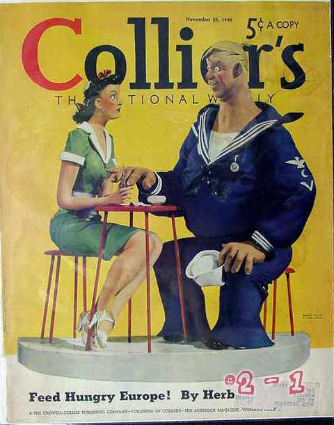 Original vintage magazine print cover, COLLIER'S. Clay models of sailor and girl by Alan Foster. Mailing sticker on bottom corner. Light staining. Would matte and frame nicely. Old November 23, 1940 Collier's cover.
