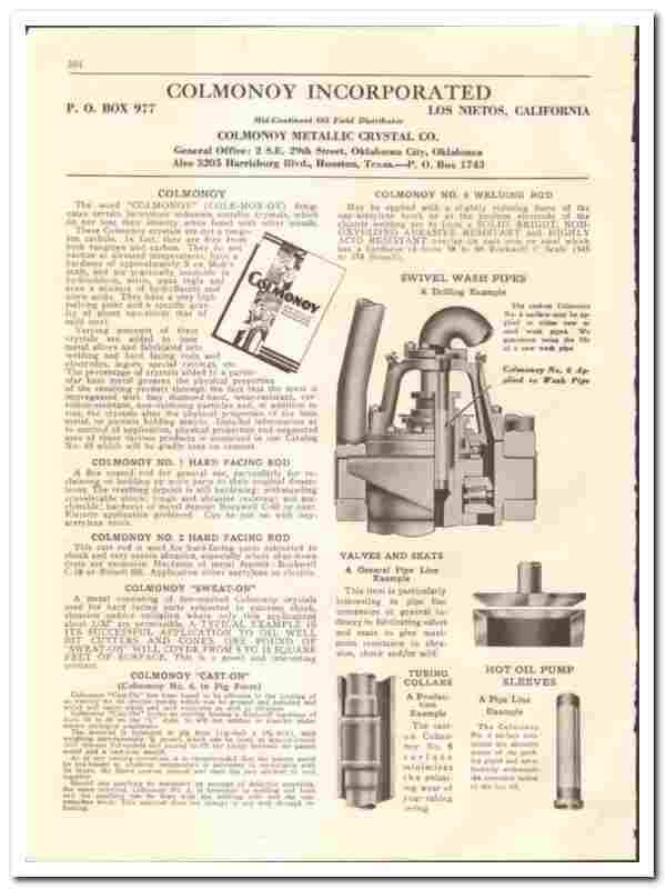 Original 1936 Oil and Gas trade vintage catalog for COLMONOY, INC. Main office and plant were located in Los Nietos, CA. The Mid-Continent Oilfield Distributor was the Colmonoy Metallic Crystal Company, at 2 SE 29th Street, Oklahoma City, OK. and also at 3205 Harrisburg Blvd, Houston, TX.
