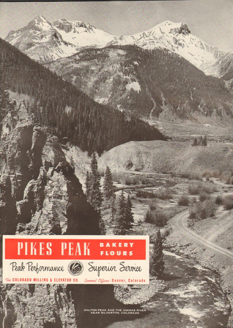 Original commercial bakery trade magazine vintage ad for THE COLORADO MILLING ELEVATOR COMPANY in Denver, CO. Salton Peak and the Animas River near Silverton is pictured. Pikes Peak bakery flours. 1958 unique old baking industry advertisement.