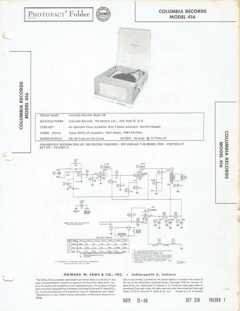 Vintage COLUMBIA RECORDS model 416 3-speed automatic record changer. phonograph. Original old Sams Photofact manual includes schematic, layout, alignment instructions, voltage & resistance test chart, repair parts list and description. 2 pages. Dated 1956. Columbia Records, of New York City, NY. This manual would make a sensational accompaniment to your classic phono equipment.