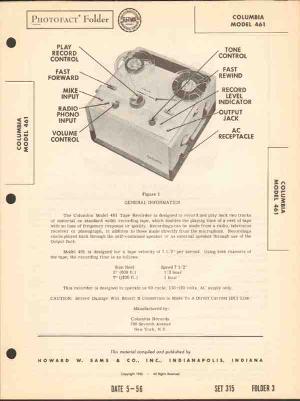 columbia model 461 tape recorder playback sams photofact manual