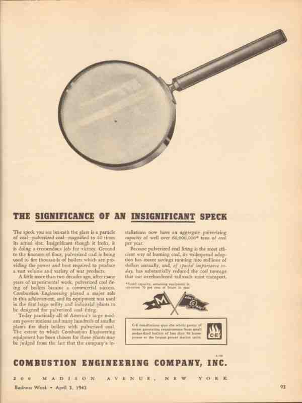 Original industrial trade vintage ad for COMBUSTION ENGINEERING COMPANY. Main office and factory were located in New York City, NY. The Significance of an Insignificant Speck. Pulverized coal is being used to fire thousands of boilers which are providing the power and heat required to produce a vast volume and variety of war products. Old 1943 WW2 era propaganda magazine advertisement.