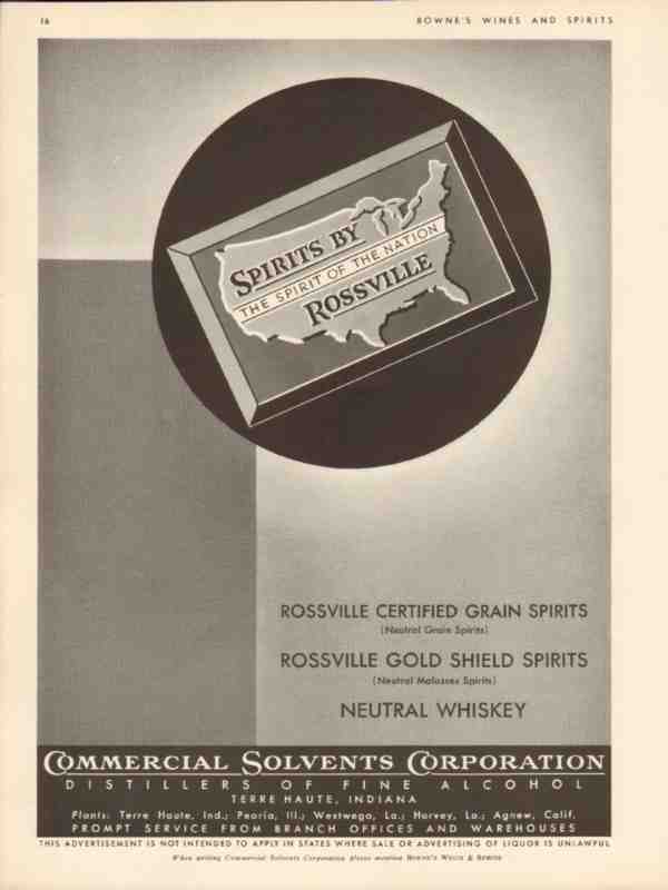 Original vintage whiskey trade ad for COMMERCIAL SOLVENTS CORPORATION. Main office and factory were located in Terre Haute, IN. Distillers of Fine Alcohol. Spirits by Rossville. Certified Grain Spirits, Gold Shield, Neutral Whiskey. Old 1935 post Prohibition era magazine advertisement.