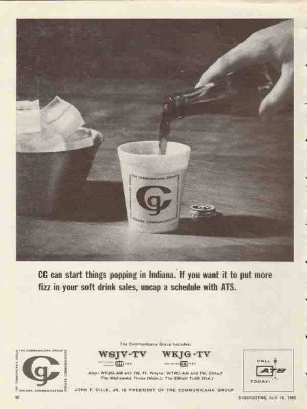 Original vintage broadcasting trade ad for COMMUNICANA GROUP , John F. Dille, Jr. President. WSJV TV Channel 28 of South Bend, Elkhart, IN and WKJG TV Channel 33 of Fort Wayne. Also WKJG-AM and FM, and WTRC-AM and FM. CG can start things popping Indiana. If you want it to put more fizz in your soft drink sales, uncap a schedule with ATS. Old 1965 radio and television broadcasting industry advertisement.