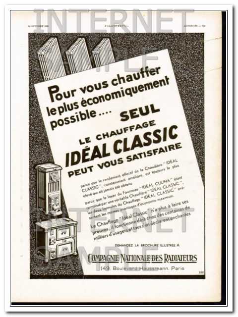 Original radiator vintage ad for COMPAGNIE NATIONALE DES RADIATEURS. Main office and factory were located in Paris, France. Most Economical Heating Furnace, the Ideal Classic and Ideal Culina Radiators. Ad is written entirely in French. There are two tears approximately 1.5 inches on the upper right side, but will matte out very nicely. This 1930 French home heating magazine advertisement would display beautifully matted and framed.