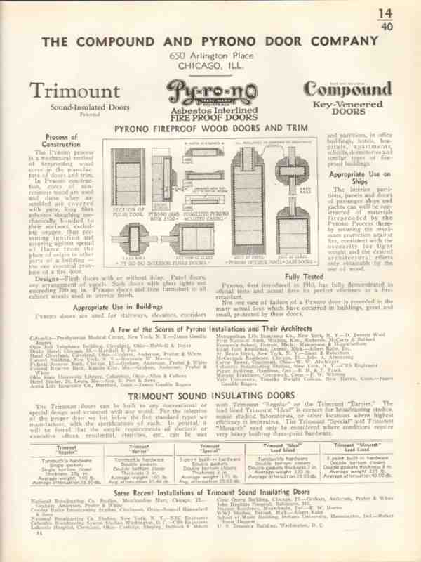 Original door trade vintage catalog for THE COMPOUND AND PYRONO DOOR COMPANY, was located at 650 Arlington Place, Chicago, IL. Manufacturers of Pyrono Fireproof Wood Doors. Trimount Sound-Insulated Doors, Py-ro-no Asbestos Interlined Fire Proof Doors and Compound Key-Veneered Doors. Disbound from a large 1938 construction materials book, this unique old one page technical specification brochure would display wonderfully matted and framed.
