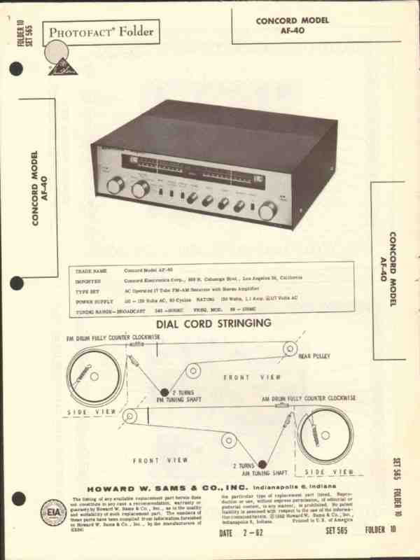 Vintage CONCORD ELECTRONICS model AF-10 AM FM Stereo Receiver Amplifier. Original old Sams Photofact manual with schematic,s layouts, alignment, adjustments, and parts list. 10 pages. Dated 1962. 17 tubes. Concord Electronics Corporation of Los Angeles, CA. This would make a sensational accompaniment to your vintage audio equipment.