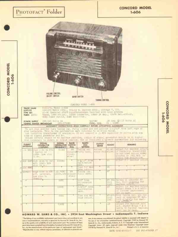 Vintage CONCORD model 1-606 6 tube Superheterodyne AM radio receiver. Original old Sams Photofact manual includes schematics, layouts, alignment, adjustments, repair parts list. 6 pages. Dated 1948. Concord Radio Corp. of Chicago, IL. This manual would make a sensational accompaniment to your vintage audio equipment.