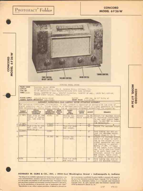 Vintage CONCORD model 6F26W 6 tube Superheterodyne AM SW radio receiver. Original old Sams Photofact manual includes schematic, layout, alignment instructions, voltage & resistance test charts, repair parts list and description. 4 pages. Dated 1947. Concord Radio Corp. of Chicago, IL. This manual would make a sensational accompaniment to your classic retro radio equipment.