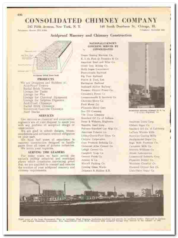 Original 1945 industrial trade vintage catalog for the CONSOLIDATED CHIMNEY COMPANY. Main office and plant were located at 545 Fifth Avenue, New York, NY. and at 140 South Dearborn Street, Chicago, IL.