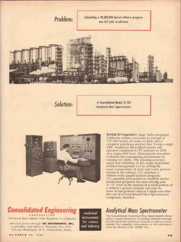 Original oil and gas trade magazine vintage ad for CONSOLIDATED ENGINEERING CORPORATION of Pasadena, CA. Analytical Mass Spectrometer used at Richfield Oil Corporation's huge fully integrated California refinery. This unique 1953 old petroleum refinery process equipment magazine advertisement would display beautifully matted and framed.