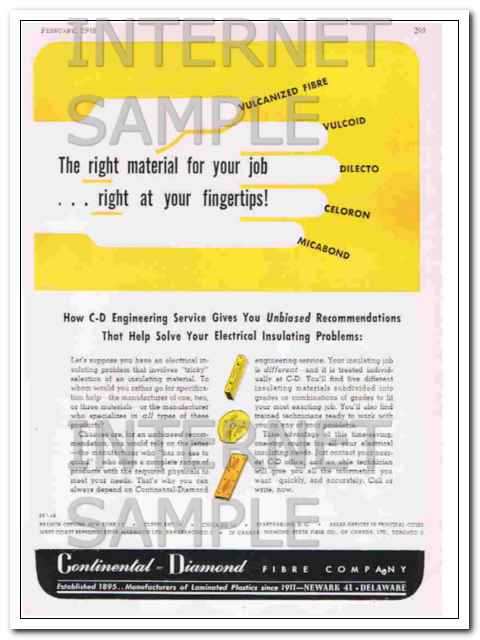 Original vintage industrial magazine ad, for CONTINENTAL-DIAMOND FIBRE COMPANY of Newark, DE. The Right material for your Job Right At Your Fingertips! How C-D Engineering Service Give You Unbiased Recommendations that Help Solve Your Electrical Insulating Problems. Old 1948 dated industry advertisement. (The scan shows a slight pink tint that is not on the actual ad.)
