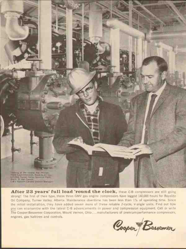 Original oil and gas trade magazine vintage ad for THE COOPER-BESSEMER CORPORATION of Mt. Vernon, OH. Shown in picture is Mr Ray Phillips, Field Superintendent, Royalite Oil Company, Turner Valley Gasoline Plant and Mr E.D. Van Fossen, C-B's Western Canada District Manager. C-B Compressors running strong. This unique 1962 old petroleum gas compressor equipment magazine advertisement would display beautifully matted and framed.