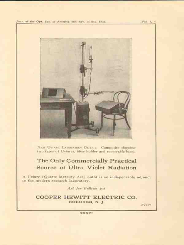 Original vintage optical industry trade magazine ad for COOPER HEWITT ELECTROC COMPANY of Hoboken, NJ. The Only Commercially Practical Source of Ultra Violet Radiation. Uviarc Laboratory Outfit. Old 1923optical medical laboratory equipment advertisement.