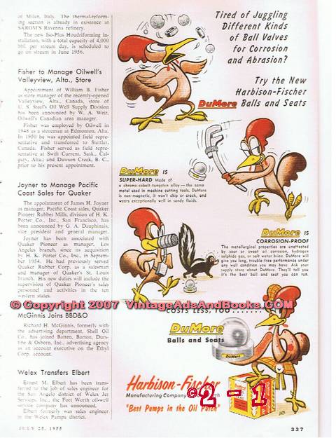 Original oil and gas trade magazine vintage ad for CORE LABORATORIES, INC., of Dallas, TX. Petroleum Reservoir Engineering. Out for A Spin at 6500 RPM. Core Lab's Research and Development Department accepts not only the new and unique problems of reservoir behavior but also maintains a constant program of improving its own standardized techniques and procedures. Unique 1955 old oilfield petroleum drilling industry magazine advertisement. Nice graphics. On the reverse side is a fractional page ad for HARBISON-FISCHER MANUFACTURING COMPANY of Fort Worth, TX. Best Pump in the Oil Patch. Harbison-Fischer DuMore Balls and Seats. Unique 1955 petroleum industry advertisement. Approximate page size 9 x 12 inches.