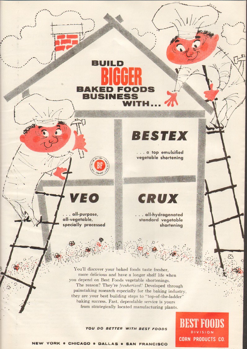 Original commercial bakery trade magazine vintage ad for CORN PRODUCTS COMPANY in New York City. Bestex, Veo, Crux vegetable shortenings build bigger baked foods business. 1959 unique old baking industry advertisement.
