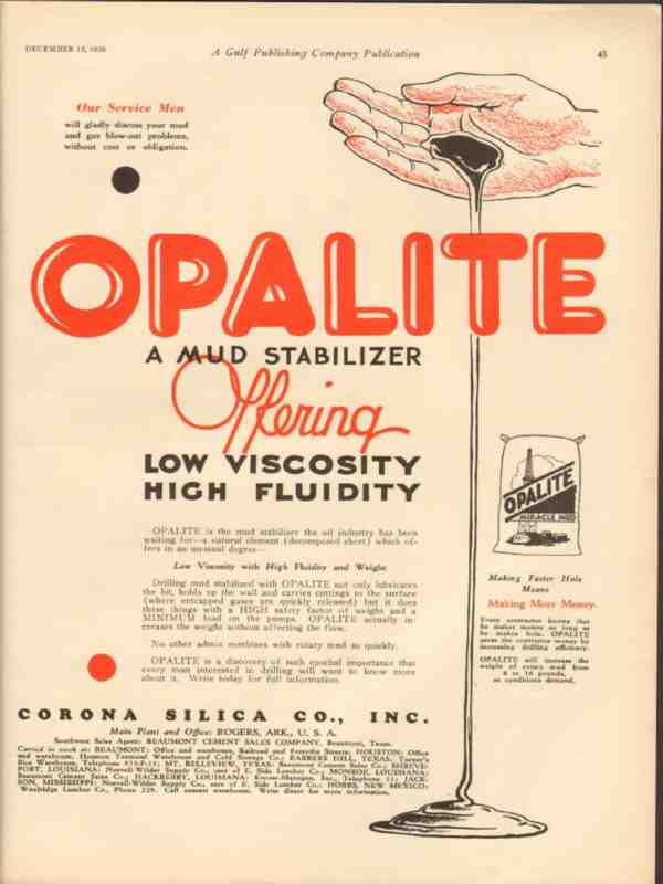 Original oil and gas oilfield drilling industry trade magazine vintage ad for CORONA SILICA COMPANY, INC. of Rogers, AR. Opalite A Mud Stabilizer Offering Low Viscosity, High Fluidity. Making faster hole means making more money. Old 1930 petroleum equipment magazine advertisement.