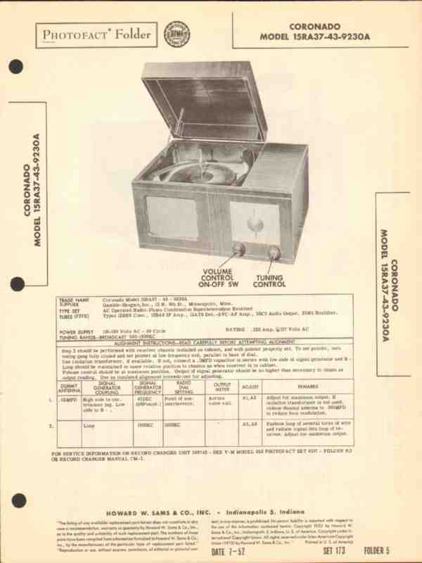 Vintage CORONADO model 15RA37-43-9230A 5 tube combination Superheterodyne AM radio receiver with phonograph record player. Original old Sams Photofact manual includes schematic, layouts, alignment info, voltage & resistance test chart, repair parts list. 4 pages. Dated 1952. Gamble-Skogmo Inc. of Minneapolis, MN.