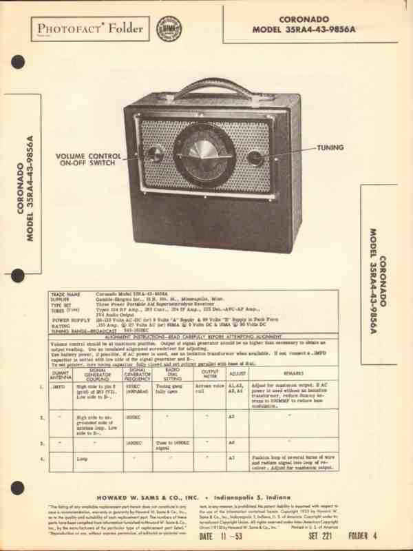 coronado model 35ra4-43-9856a am radio receiver sams photofact manual