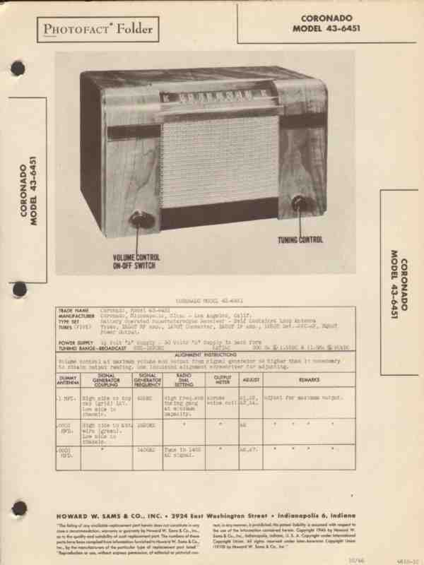 Vintage CORONADO model 43-6451 Superheterodyne 5 tube AM radio receiver. Original old Sams Photofact manual includes schematic, layout, alignment instructions, voltage & resistance test charts, repair parts list and description. Dated 1946. 4 pages. Coronado, of Minneaplois, MN and Los Angeles, CA. This manual would make a sensational accompaniment to your classic retro radio equipment.