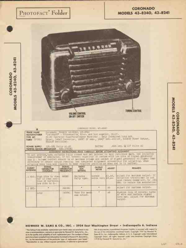 coronado model 43-8240 -8241 am radio receiver sams photofact manual