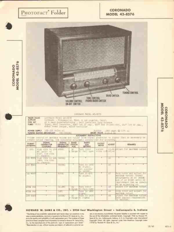 Vintage CORONADO model 43-8576 Superheterodyne 6 tube AM SW radio receiver. Original old Sams Photofact manual includes schematic, layout, alignment instructions, voltage & resistance test charts, repair parts list and description. Dated 1946. 4 pages. Coronado, of Minneaplois, MN and Los Angeles, CA. This manual would make a sensational accompaniment to your classic retro radio equipment.