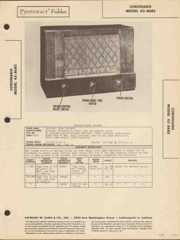 Vintage CORONADO model 43-8685 6 tube AM radio receiver. Original old Sams Photofact manual includes schematic, layout, alignment instructions, voltage & resistance test chart, repair parts list and description. 4 pages. Dated 1947. Coronado, of Minneaplois, MN and Los Angeles, CA. This manual would make a sensational accompaniment to your classic radio equipment.
