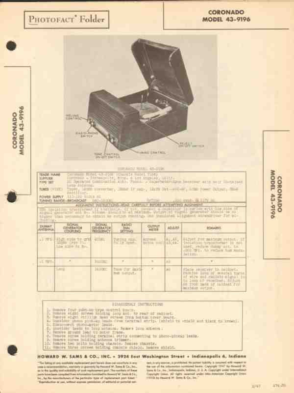 coronado model 43-9196 am radio receiver phono sams photofact manual