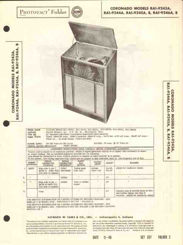 Vintage CORONADO models RA1-9243A, RA1-9244A, RA1-9245A, RA1-9245B, RA1-9246A and RA1-9246B. Combination 8 tube Superheterodyne AM radio receiver with record changer phonograph. Original old Sams Photofact manual includes schematic, layout, alignment instructions, voltage & resistance test chart, repair parts list and description. 4 pages. Dated 1956. Gamble-Skogmo Inc. of Minneapolis, MN. This manual would make a sensational accompaniment to your classic radio phono equipment.