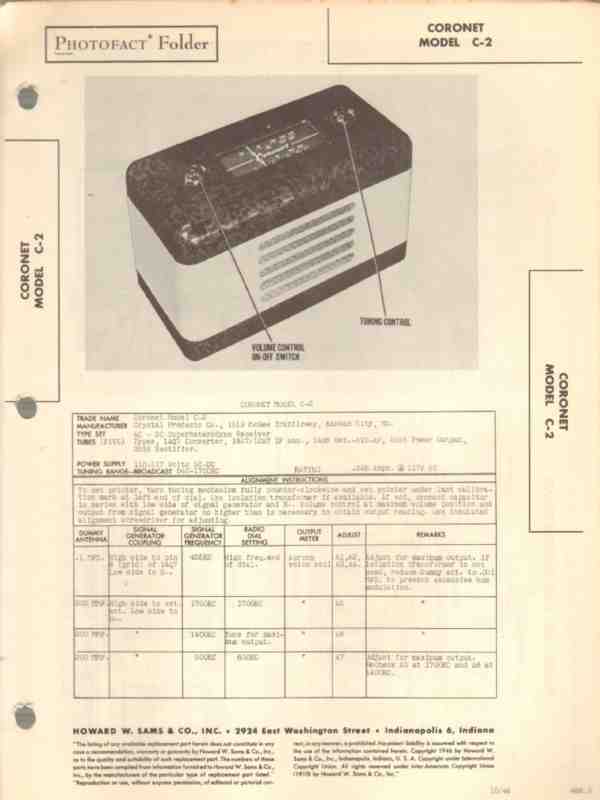 Vintage CORONET model C-2 Superheterodyne 5 tube AM radio receiver. Original old Sams Photofact manual includes schematic, layout, alignment instructions, voltage & resistance test charts, repair parts list and description. Dated 1946. 4 pages. Crystal Products Company of Kansas City, MO. This manual would make a sensational accompaniment to your classic retro radio equipment.