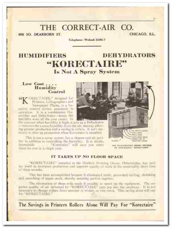 Korectaire, designed for Printers, Lithographers, and Newspaper Plants, is the humidity control device, automatic in operation. It is a combination Humidifier and Dehydrator; keeps the humidity even all the year round. In the summer when humidity is high, it acts as a Dehydrator, removes the excess humidity from the air, thereby effecting greater production and saving enrollers. It isn't necessary to slow up production when Korectaire is installed. This is not a spray system, but a cleaner and air purifier in addition to controlling the humidity.