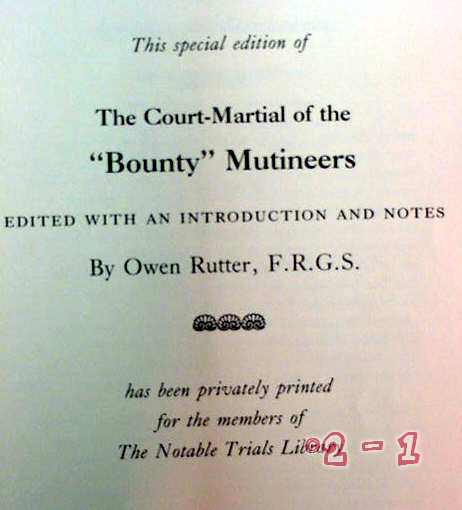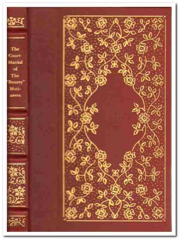 Hard covered book titled THE COURT MARTIAL OF THE "BOUNTY" MUTINEERS Special Edition. Edited with an Introduction and notes by Owen Rutter, Privately Printed for the member of The Notable Trials Library, marbled end pages, numbered, gilded pages, 1989, illustrated, 202 pages.
