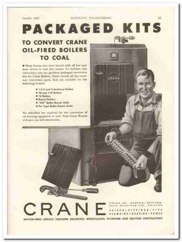 Original vintage magazine ad for CRANE COMPANY. Home Kits Convert oil-fired boiler to coal. Many homes that were heated with oil last year must switch to coal this winter to conserve fuel. To facilitate this, you can purchase packaged-conversion kits for Crane boilers.