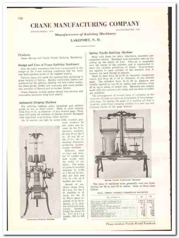 Original 1938 textile trade vintage ad for CRANE MANUFACTURING COMPANY. Main office and plant was located in Lakeport, NH.
