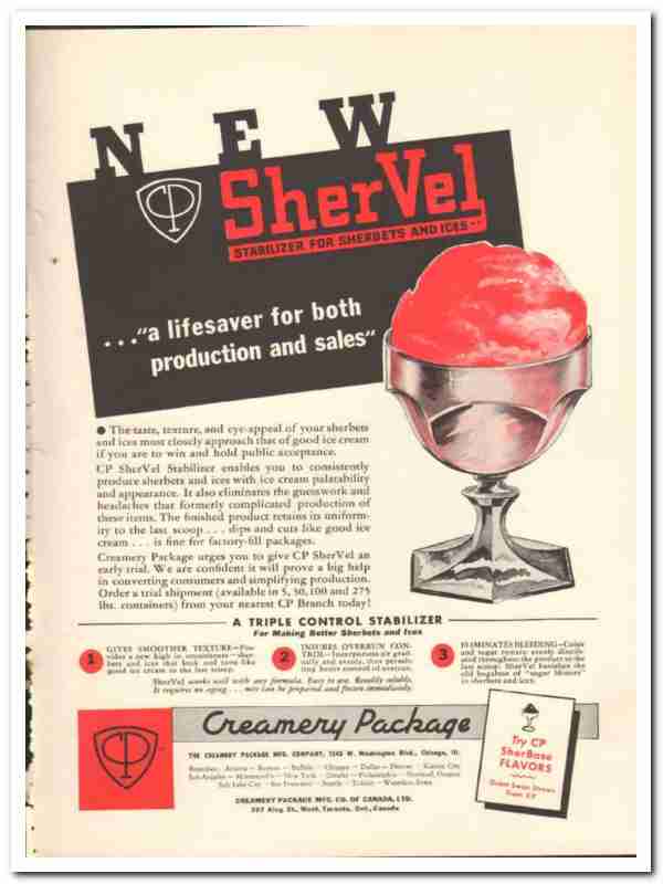 Manufacturers of SherVel, a new stabilizer for sherbets and ices. A lifesaver for both production and sales. The taste, texture and eye-appeal of your sherbets and ices must closely approach that of good ice cream is you are to win and hold public acceptance. CP SherVel Stabilizer enables you to consistently produce sherbets and ices with ice cream palatability and appearance.