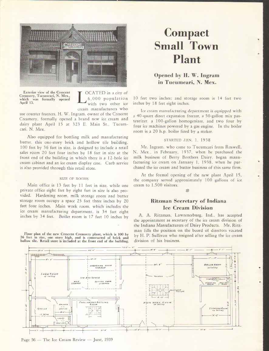 Manufacturers of Ice Cream. 'Compact Small Town Plant - Opened by H. W. Ingram in Tucumcari, NM'.