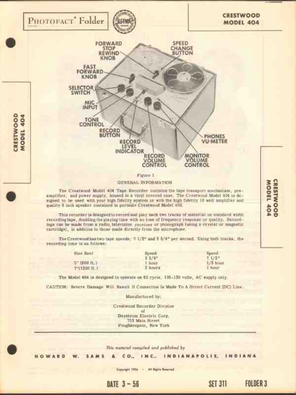 crestwood model 404 magnetic tape recorder sams photofact manual