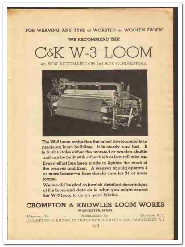 Original 1948 textile trade vintage ad for CROMPTON & KNOWLES LOOM WORKS. Main office and plant was located in Worcester, MA.