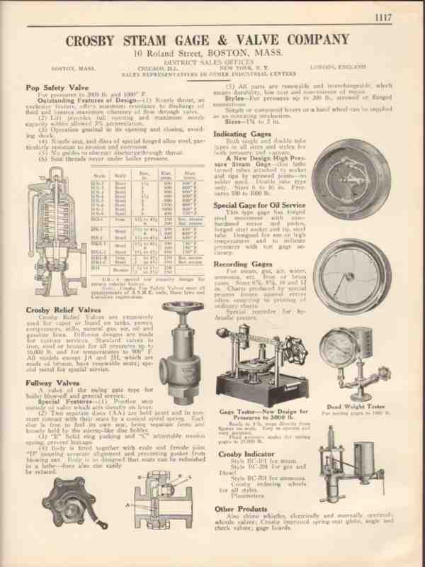 Original industrial trade vintage catalog for CROSBY STEAM GAGE & VALVE COMPANY, was located at 10 Roland Street, Boston, MA. Manufacturers of Pop Safety Valve, Relief Valve, Fullway Valve, Indicating Gages, Oil Service and Recording Gages. Disbound from a large 1931 industrial catalog, this unique old one page technical brochure would display wonderfully matted and framed. A marvelous addition to your retro industrial equipment library. Pages are detached and may contain a small amount of residual glue on edge. Slight damp stain on outer edge.