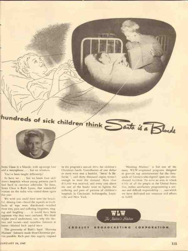 Original vintage media trade magazine ad for CROSLEY BROADCASTING CORPORATION. WLW Radio Station. Hundreds of Sick Children Think Santa Claus is a Blonde. To them, Santa Claus is Ruth Lyons. Old 1947 magazine advertising and broadcasting industry advertisement, would display beautifully matted and framed.