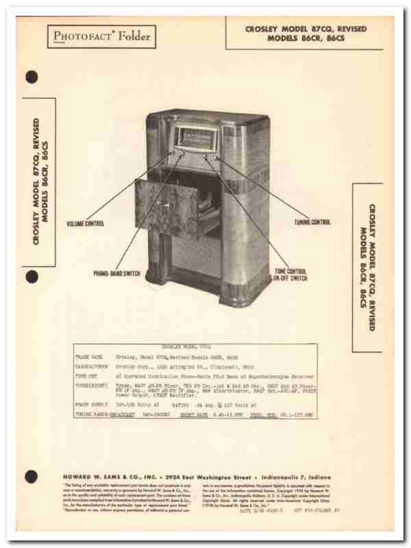 crosley model 87cq 86cr 86cs am fm radio phono sams photofact manual